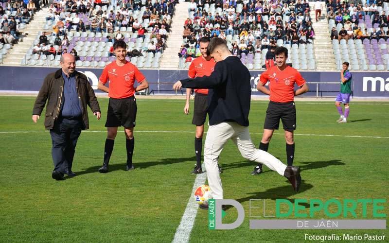 El jugador internacional Antonio Pérez se encargó de hacer el saque de honor en la previa del encuentro disputado este domingo en el estadio de La Victoria entre el Real Jaén y La Unión Atlético, correspondiente a la jornada 31 del grupo IV de la Segunda RFEF.